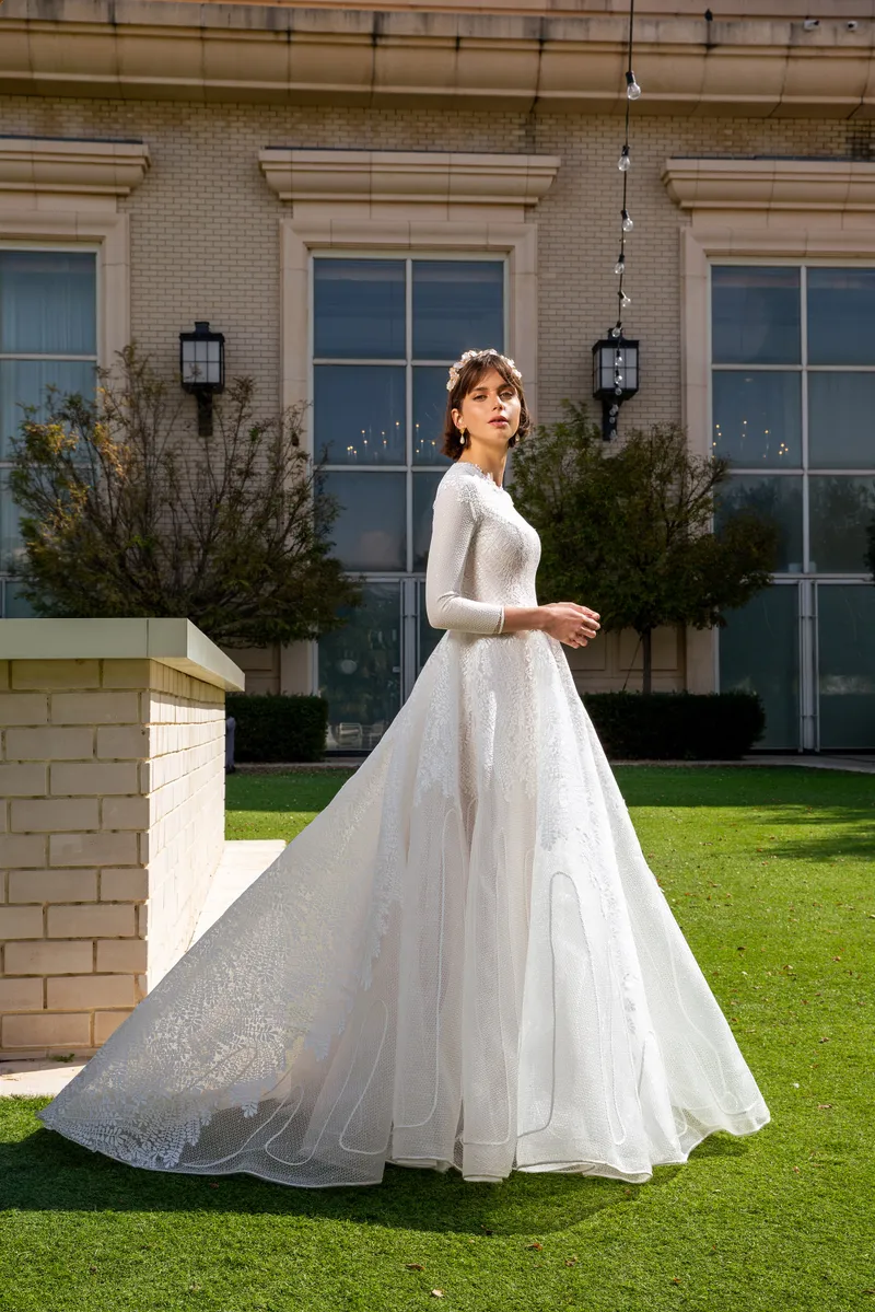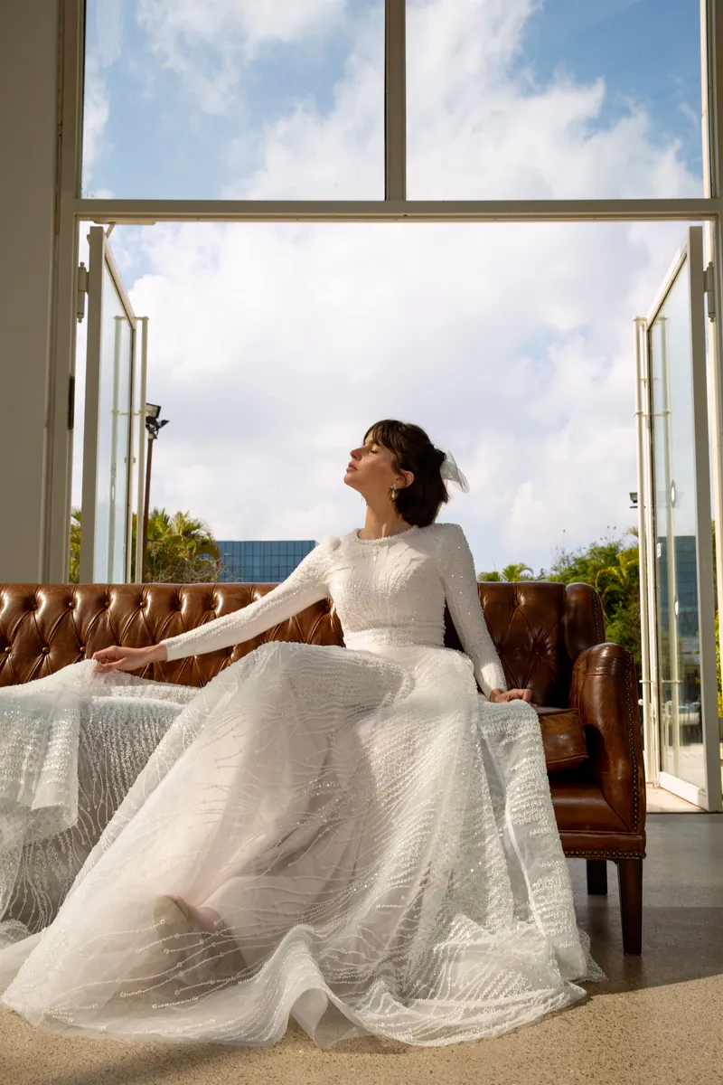 קולקציה עונתית של שמלות כלה צנועות החוגגת את אומנות חריזת היד — שמלות כלה צנועות למגזר החרדי והדתי, עם חרוזי איכות, פייטים ופנינים על תחרה בלעדית. צלליות פיסוליות מבדים באיכות אירופית. שרוולים ארוכים, סגירה גבוהה, לא שקוף.