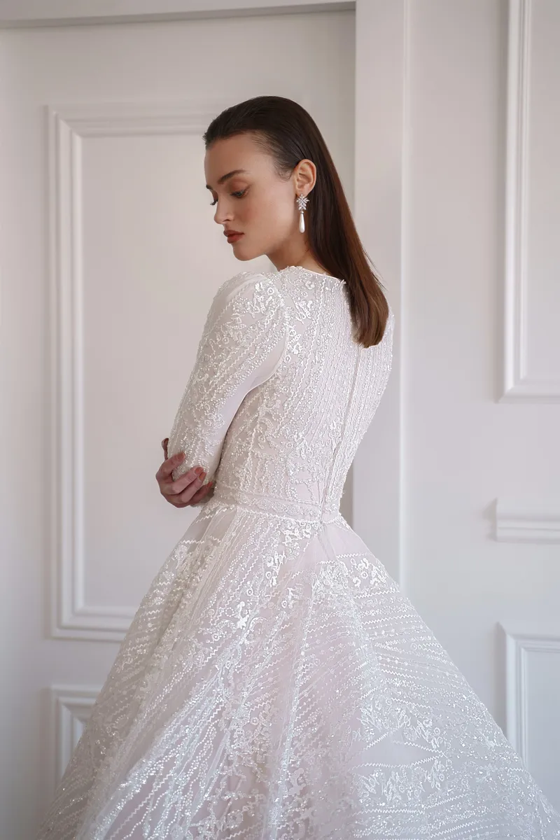 אביב/קיץ 2022Ashley היא שמלת כלה צנועה בעיצוב קוטור מקולקציית אביב/קיץ 2022 של עמליה. חריזת יד עם חרוזי איכות, פייטים ופנינים על תחרה בלעדית של עמליה. שרוולים ארוכים, סגירה גבוהה, לא שקוף — נתפרה בבדי בסיס באיכות אירופית בסטודיו שלנו בירושלים.