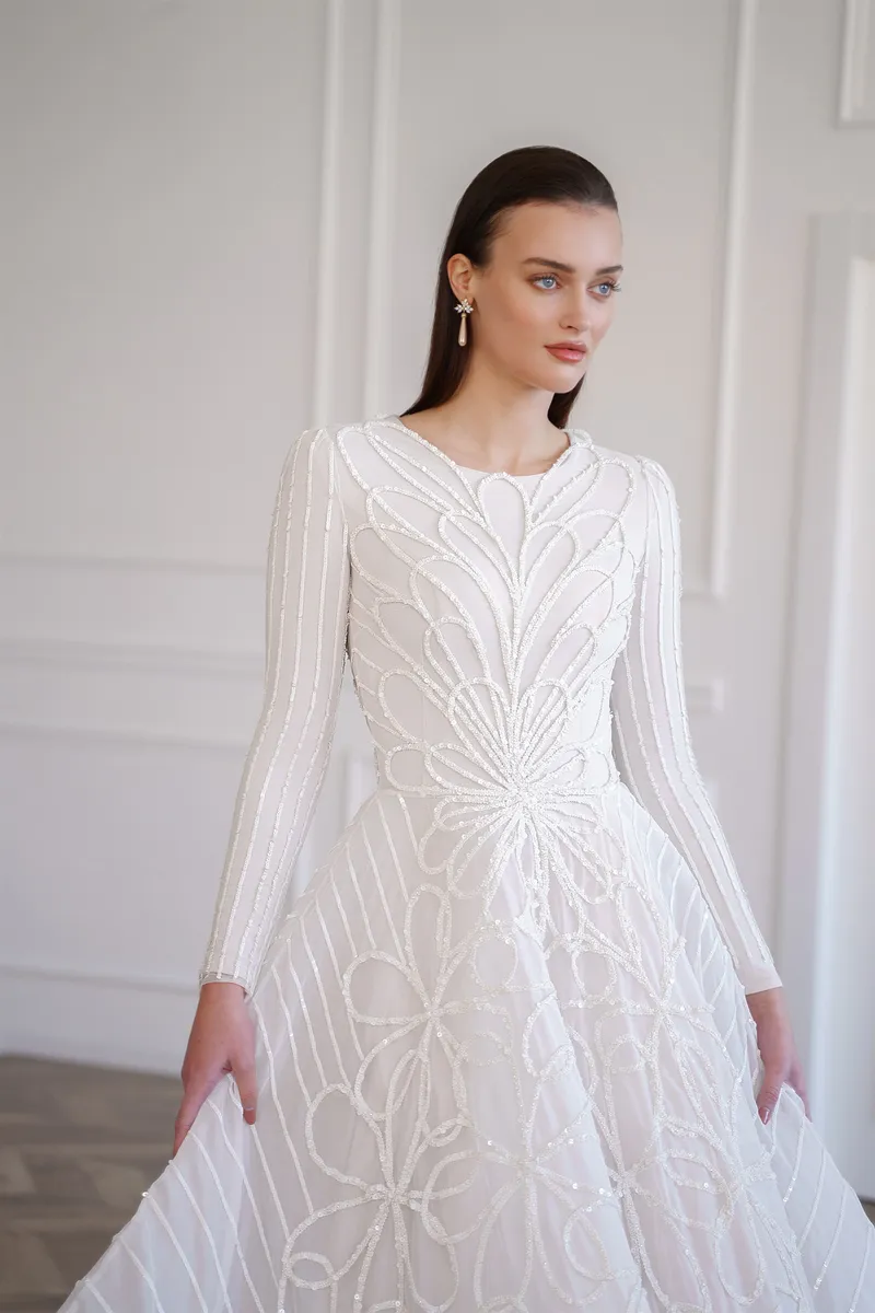 קולקציה עונתית של שמלות כלה צנועות עם תחרה בלעדית פיסולית וחריזת יד עם חרוזי איכות, פייטים ופנינים. שמלות כלה צנועות למגזר החרדי והדתי, עם קרינולינות בעיצוב בלעדי מבדים באיכות אירופית. שרוולים ארוכים, סגירה גבוהה, לא שקוף.