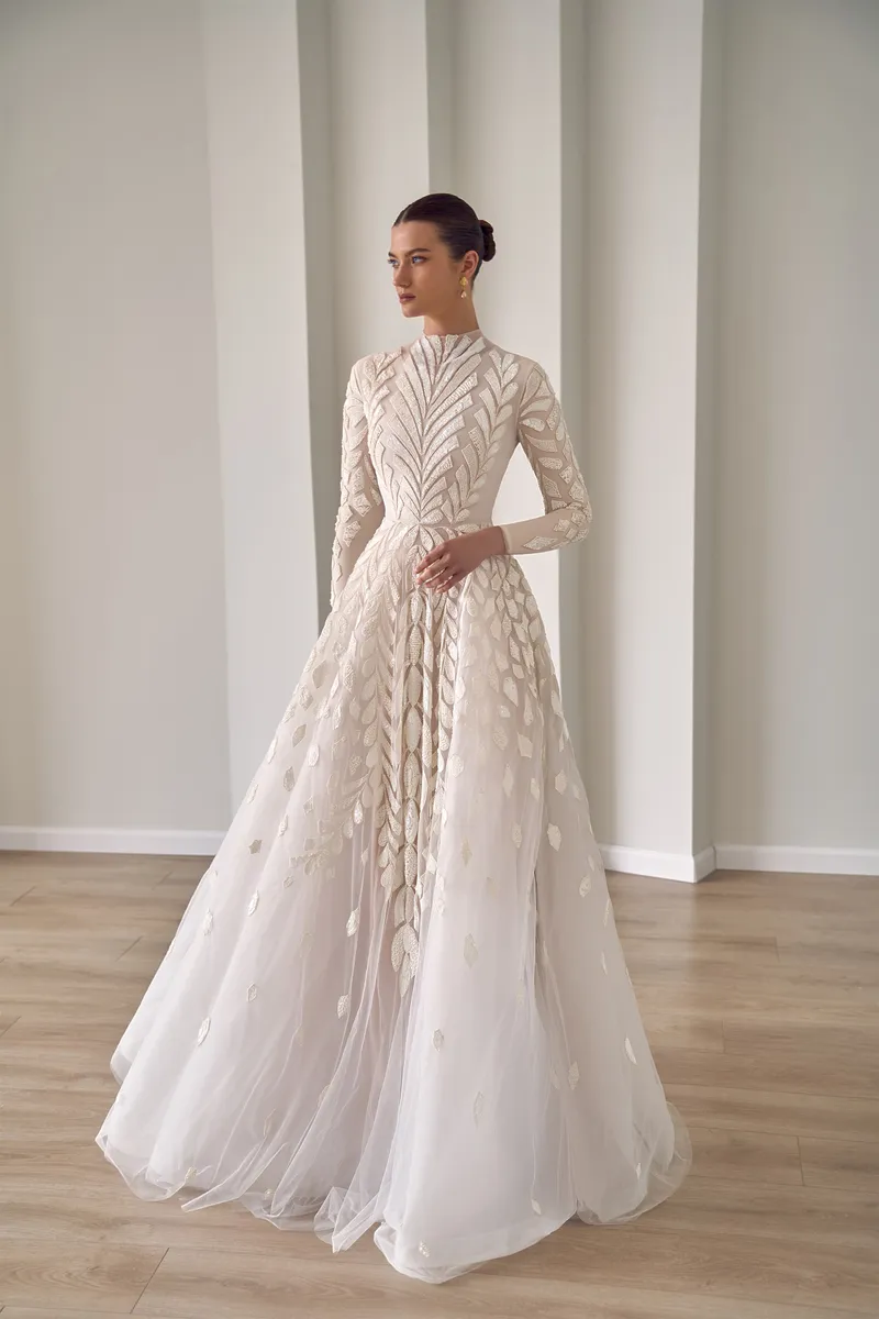 קולקציה עונתית של שמלות כלה צנועות בפאר קלאסי — שמלות רקומות ביד לכלות מהמגזר החרדי והדתי, מעוטרות בחרוזי איכות, פייטים ופנינים. תחרה בלעדית ובדי בסיס באיכות אירופית. שרוולים ארוכים, סגירה גבוהה, לא שקוף — יוקרה נצחית ללא פשרות.