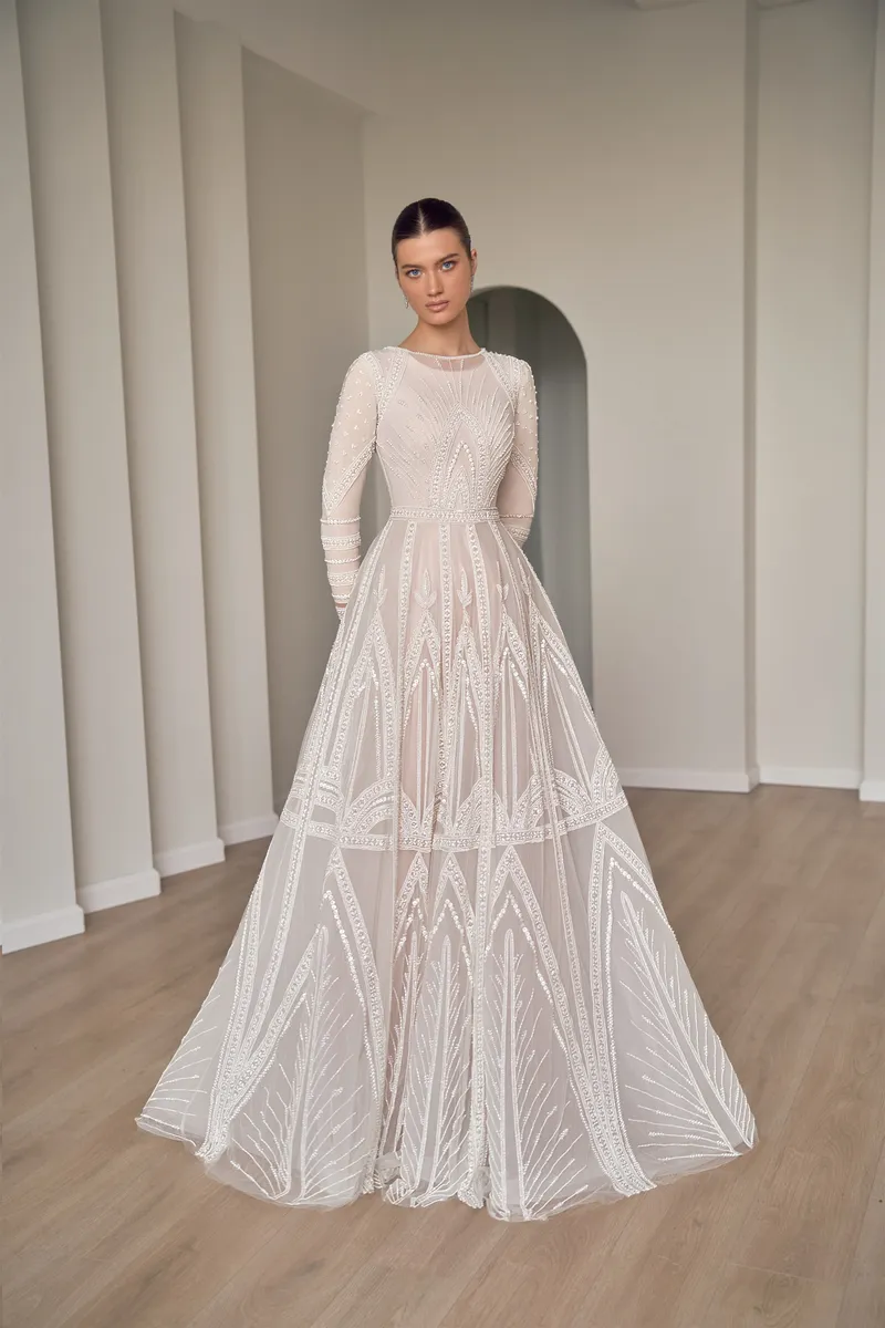 קולקציה עונתית של שמלות כלה צנועות בפאר קלאסי — שמלות רקומות ביד לכלות מהמגזר החרדי והדתי, מעוטרות בחרוזי איכות, פייטים ופנינים. תחרה בלעדית ובדי בסיס באיכות אירופית. שרוולים ארוכים, סגירה גבוהה, לא שקוף — יוקרה נצחית ללא פשרות.