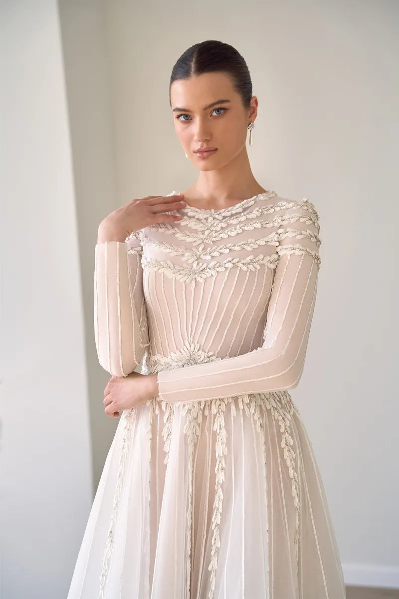 קולקציה עונתית של שמלות כלה צנועות בפאר קלאסי — שמלות רקומות ביד לכלות מהמגזר החרדי והדתי, מעוטרות בחרוזי איכות, פייטים ופנינים. תחרה בלעדית ובדי בסיס באיכות אירופית. שרוולים ארוכים, סגירה גבוהה, לא שקוף — יוקרה נצחית ללא פשרות.