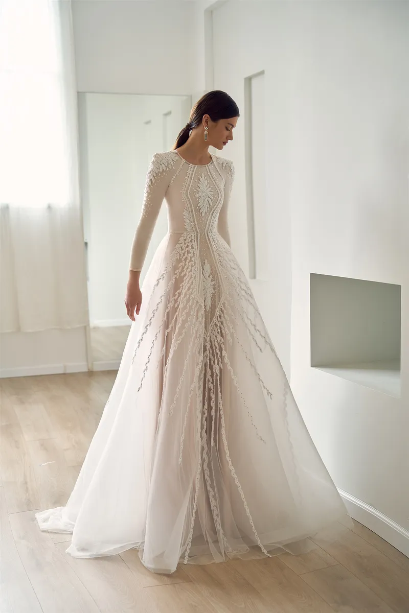 קולקציה עונתית של שמלות כלה צנועות בפאר קלאסי — שמלות רקומות ביד לכלות מהמגזר החרדי והדתי, מעוטרות בחרוזי איכות, פייטים ופנינים. תחרה בלעדית ובדי בסיס באיכות אירופית. שרוולים ארוכים, סגירה גבוהה, לא שקוף — יוקרה נצחית ללא פשרות.