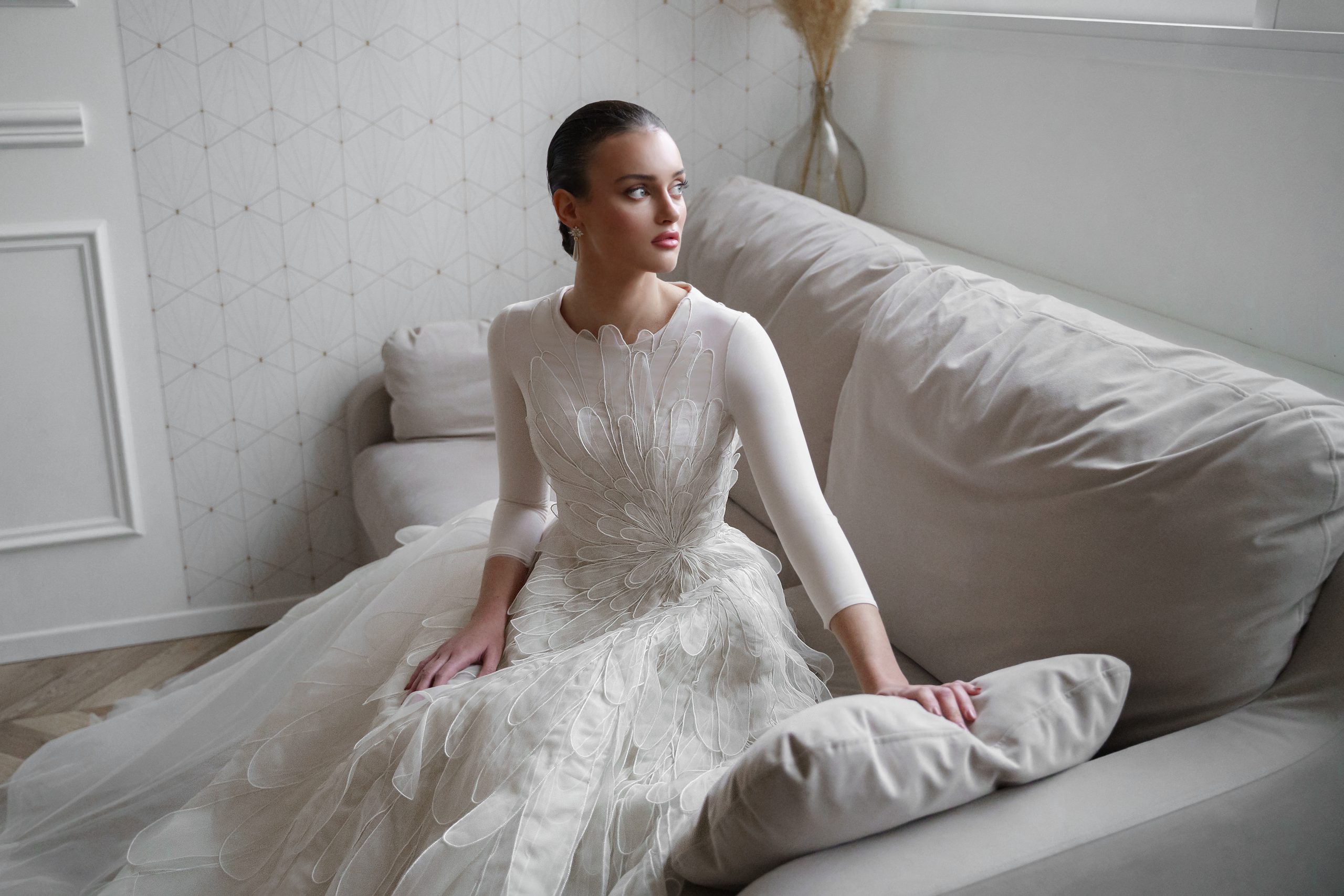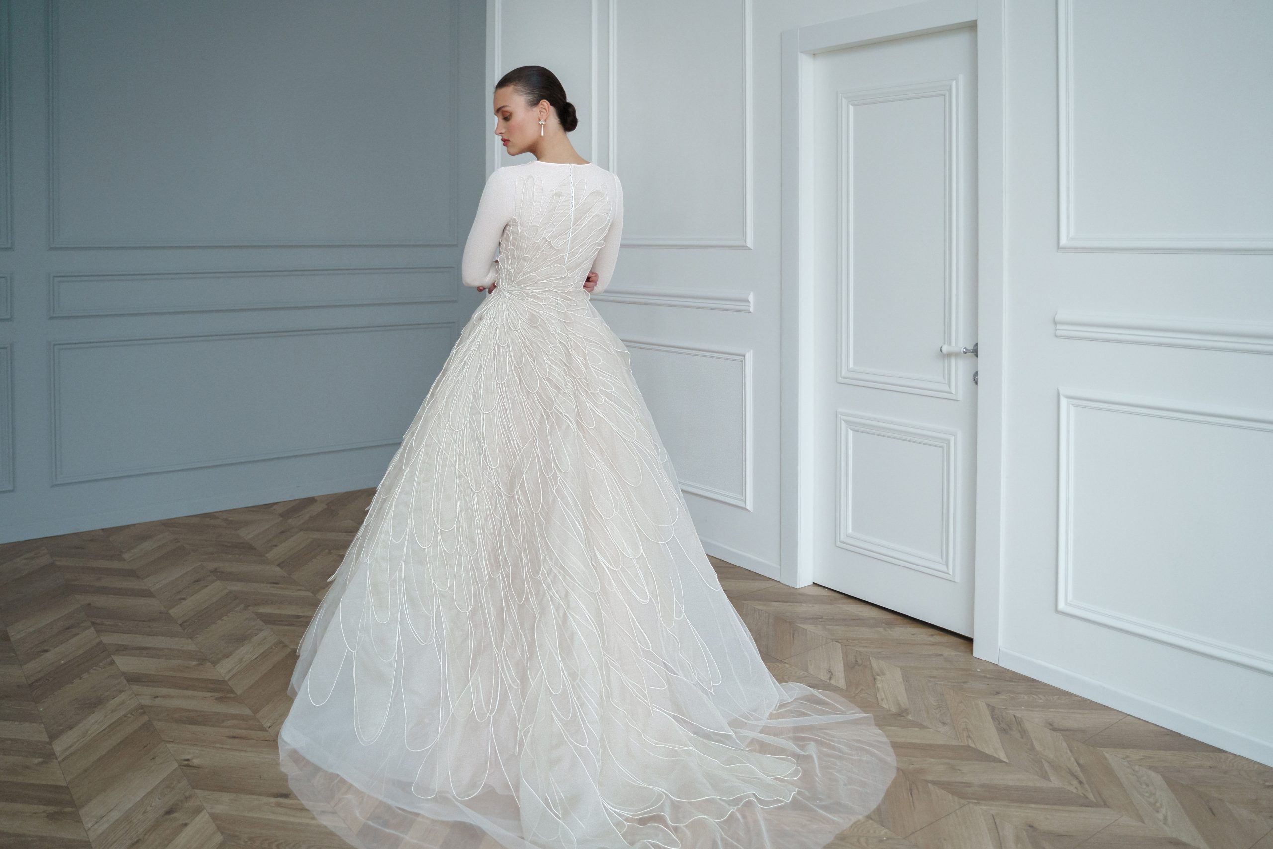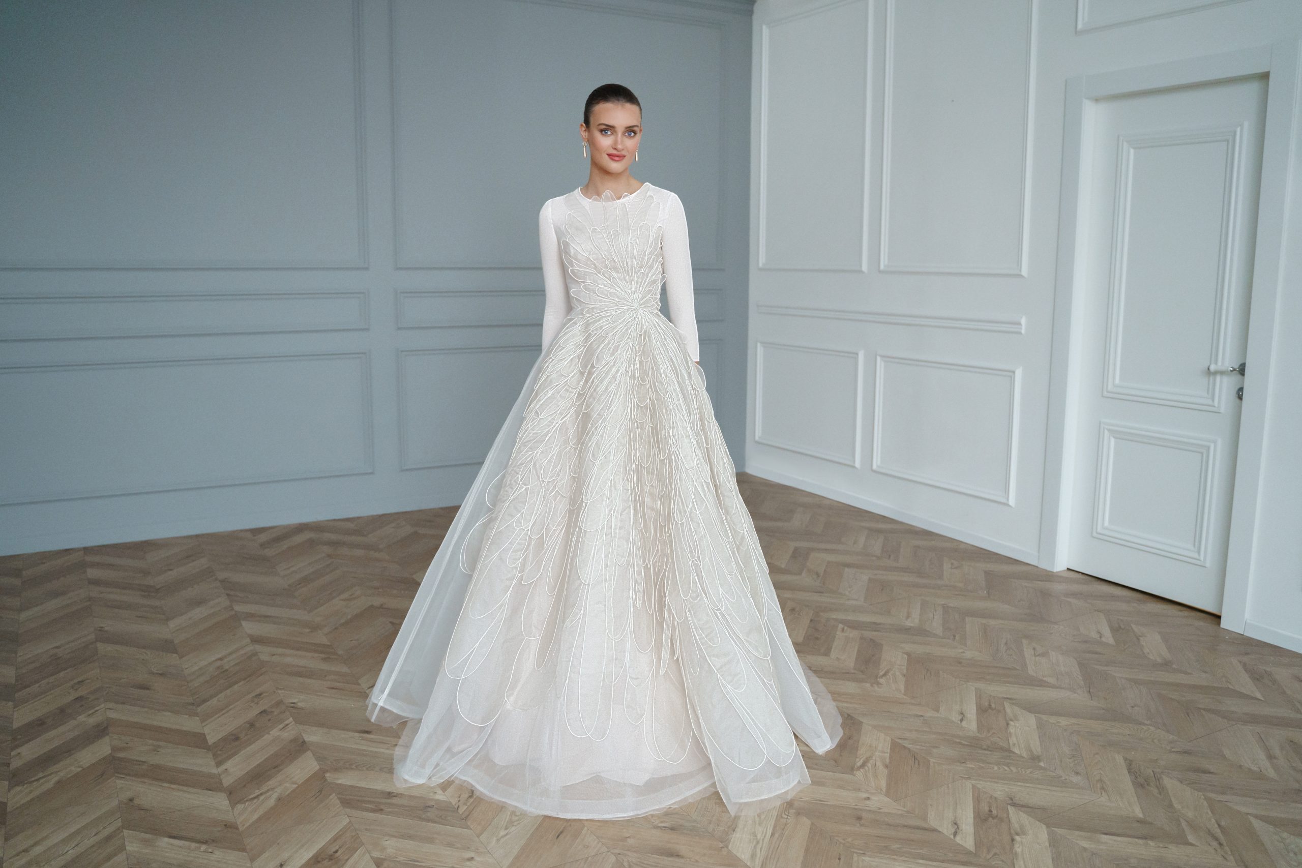 .A stunning combination of pure silk and tulle, this dress features an attractive flower design, flowinginto a delicate trail.