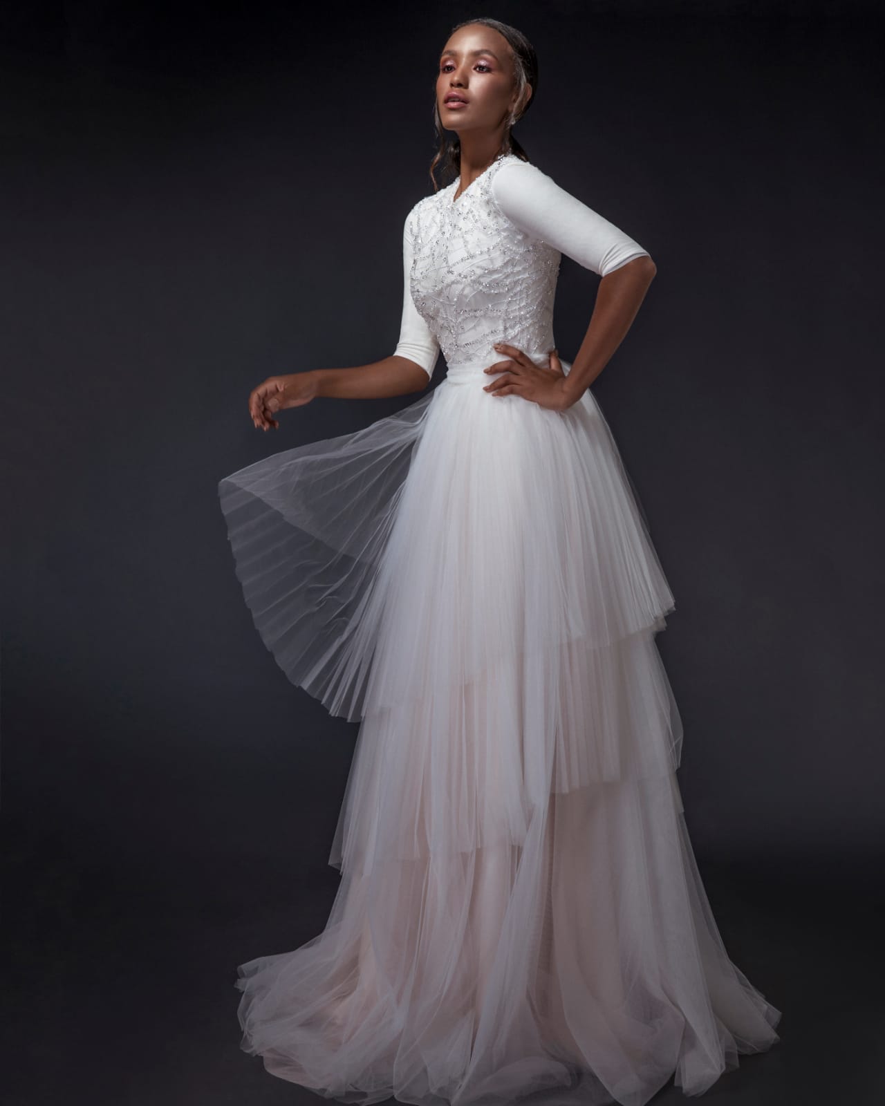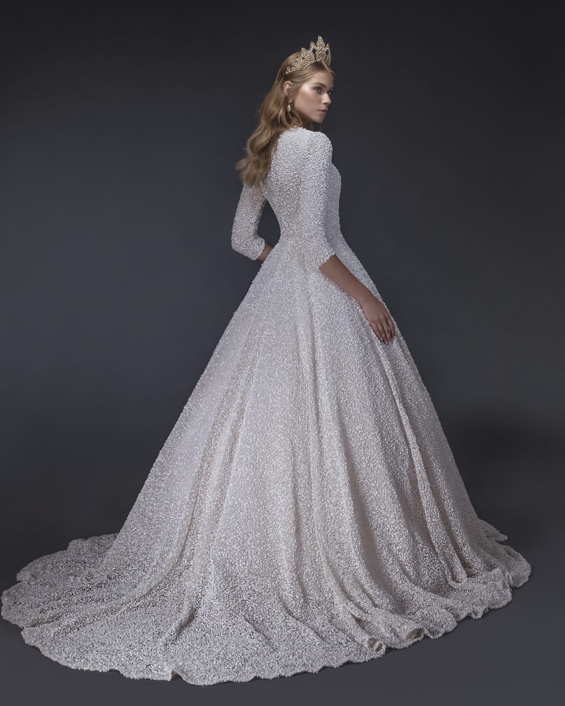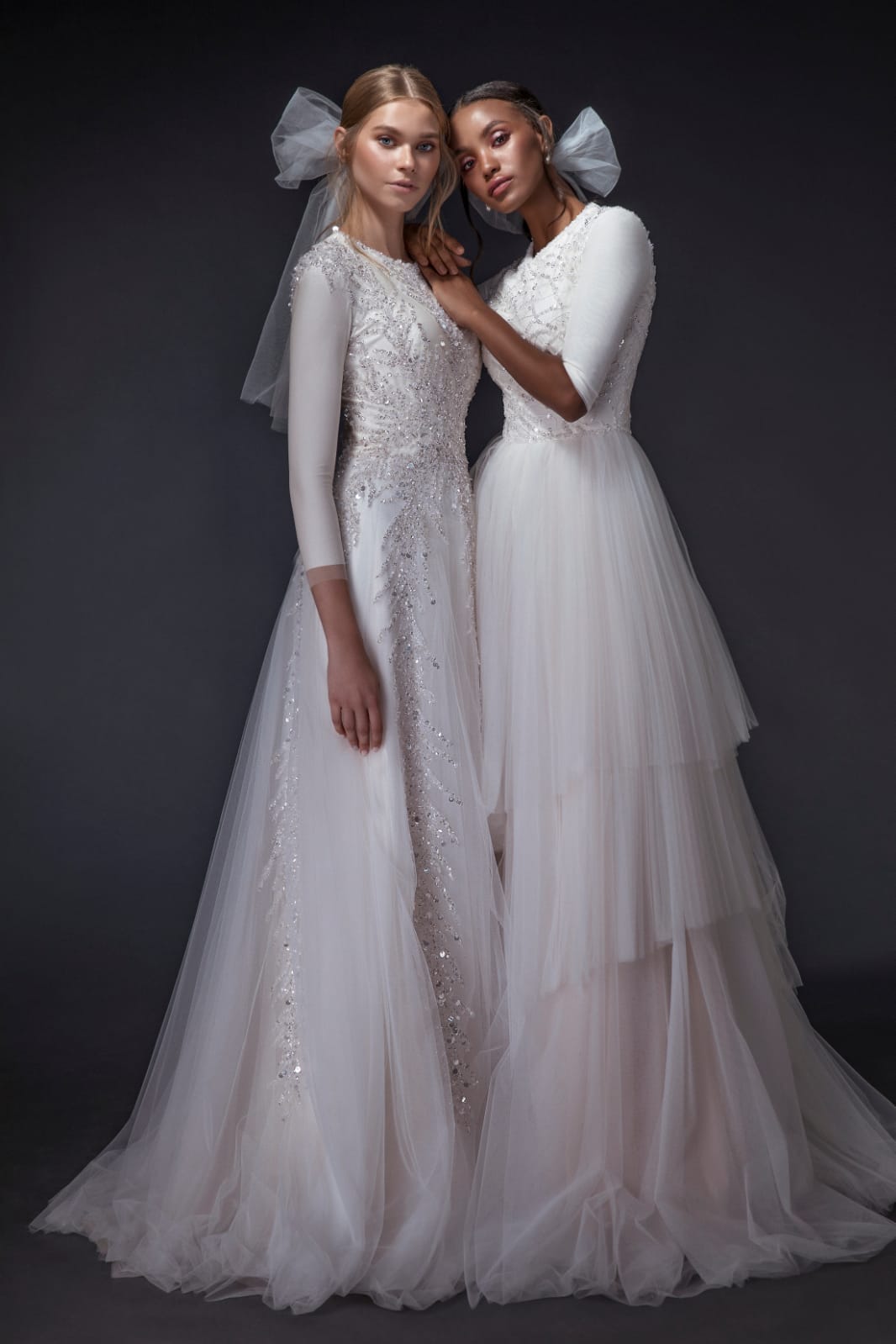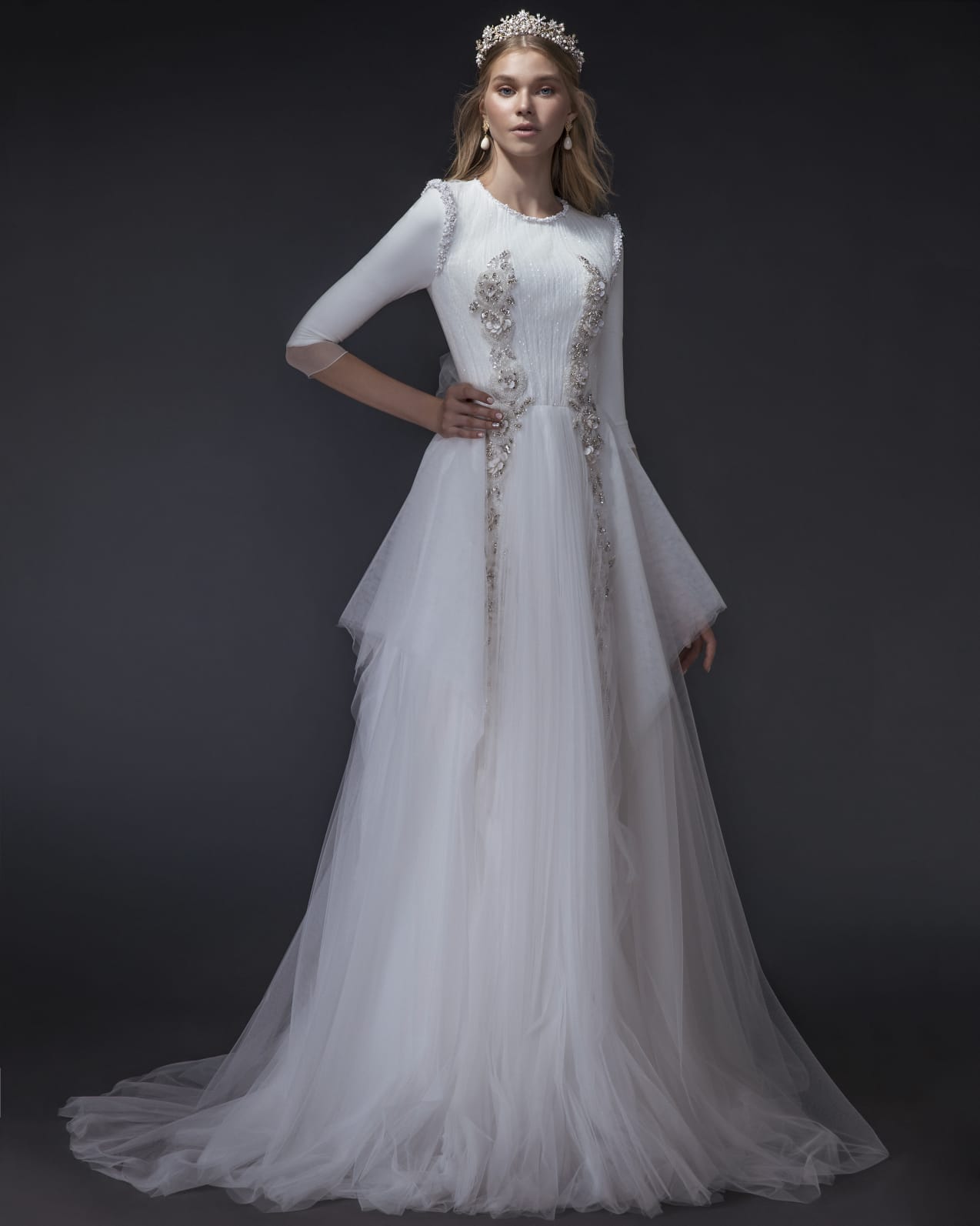 The collection is characterized by soft shades and ethnic touches, incorporating handmade beading and Indian embroidery. Luxurious materials are sewn to exact form with seamless lines and attention to every detail.