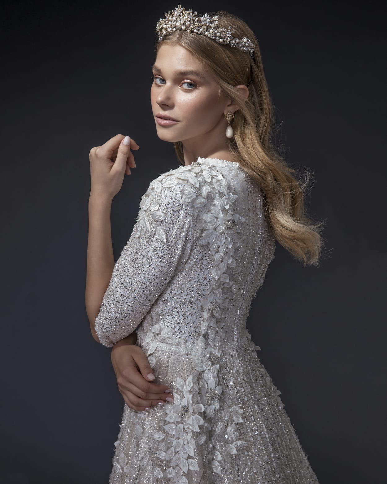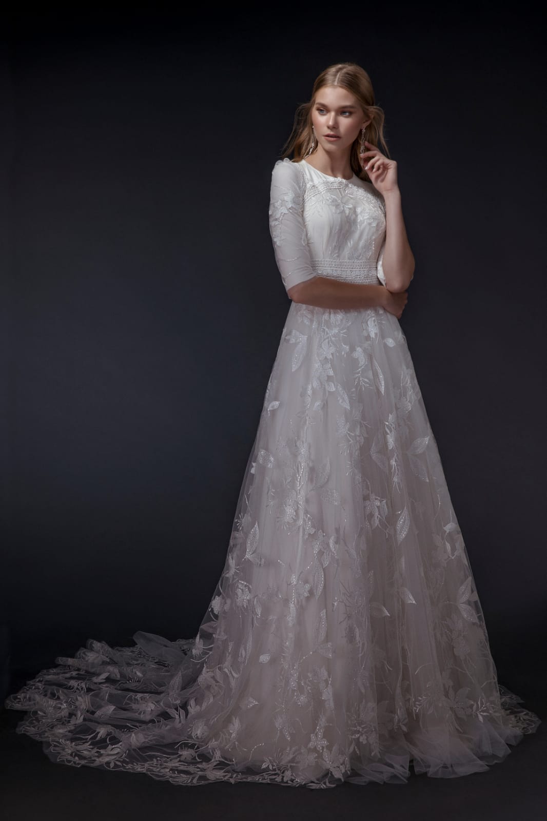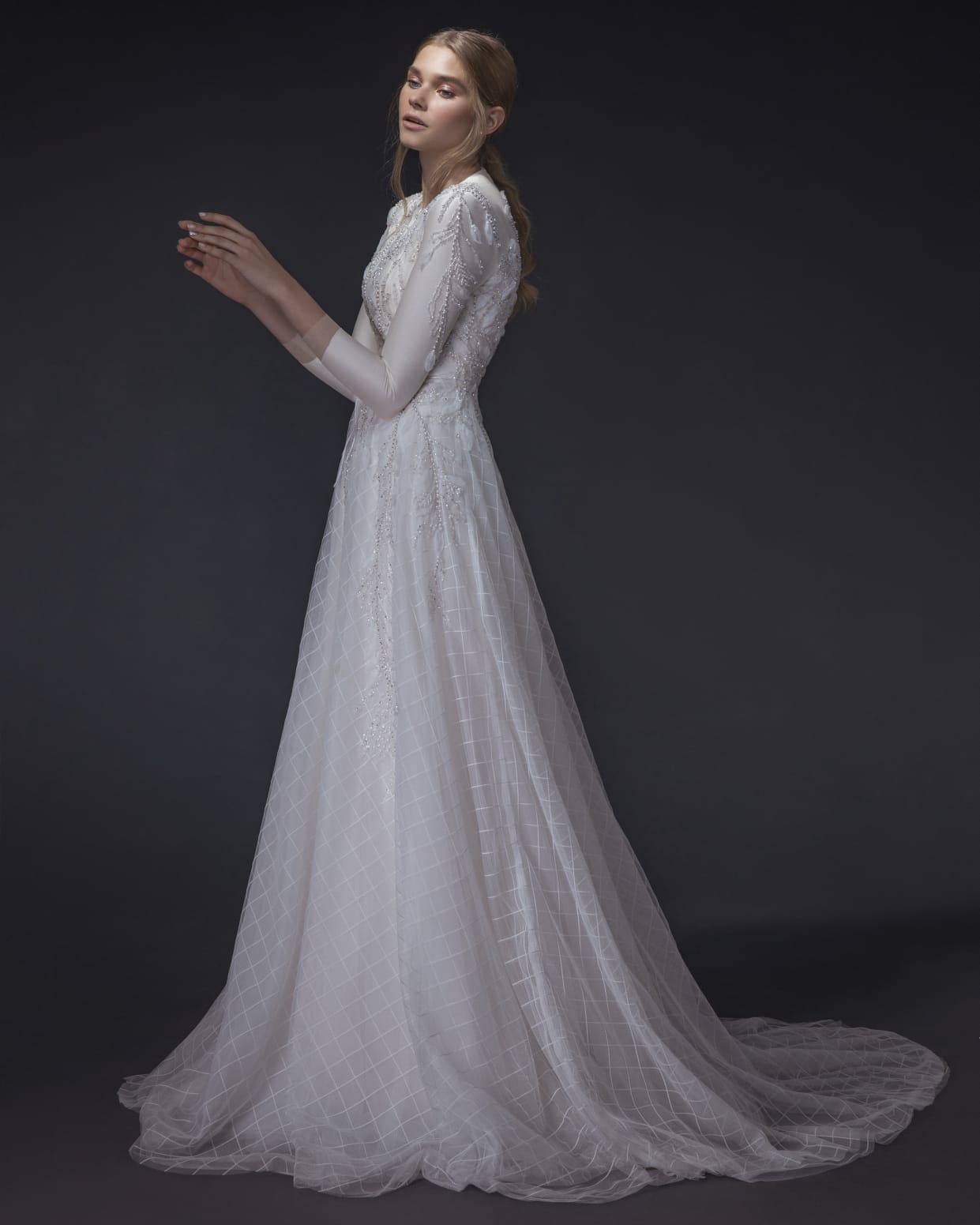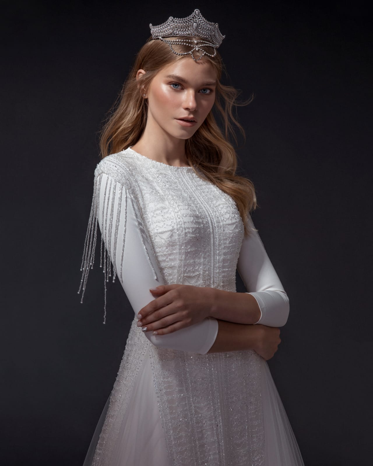 The collection is characterized by soft shades and ethnic touches, incorporating handmade beading and Indian embroidery. Luxurious materials are sewn to exact form with seamless lines and attention to every detail.