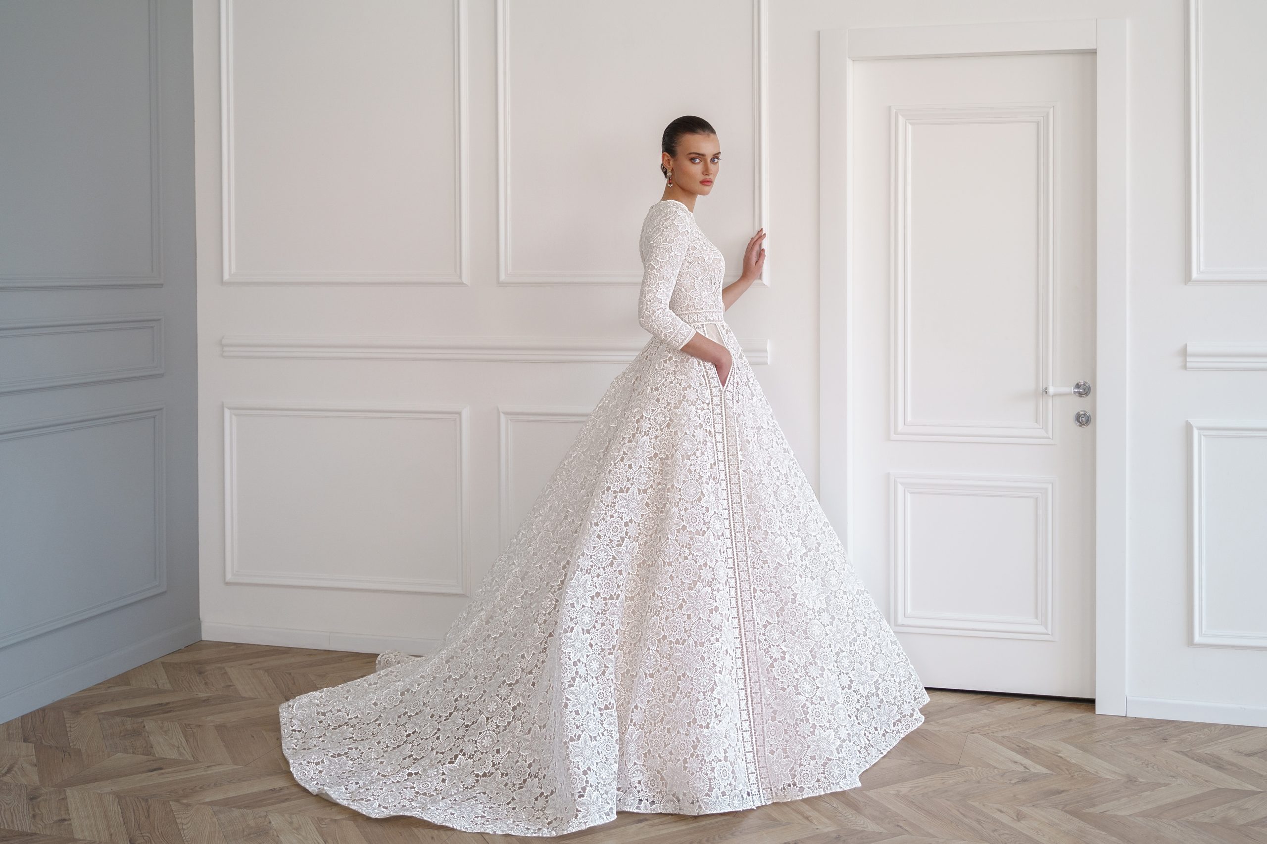 Formed from elegant and rich guipure lace, this dress includes unique pockets and is completed by abeautiful trail.