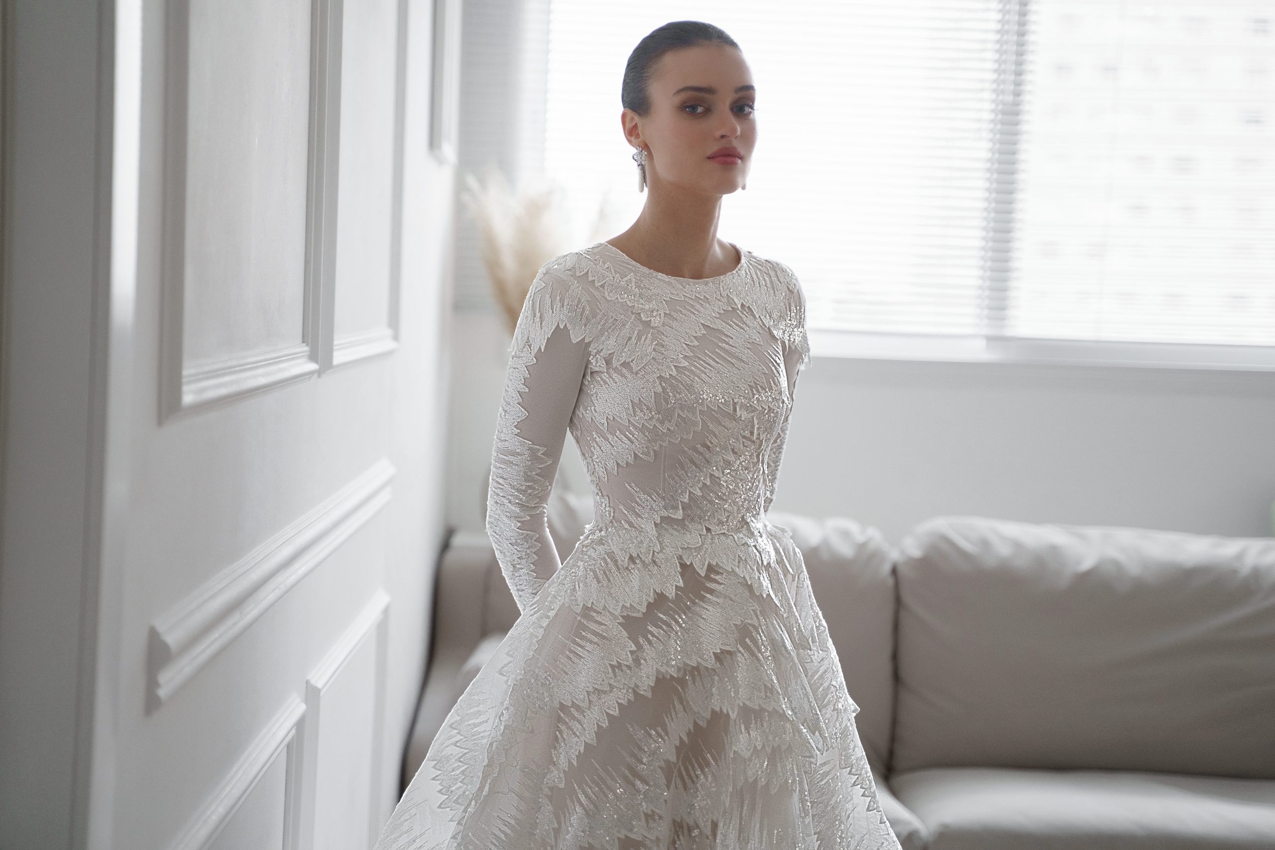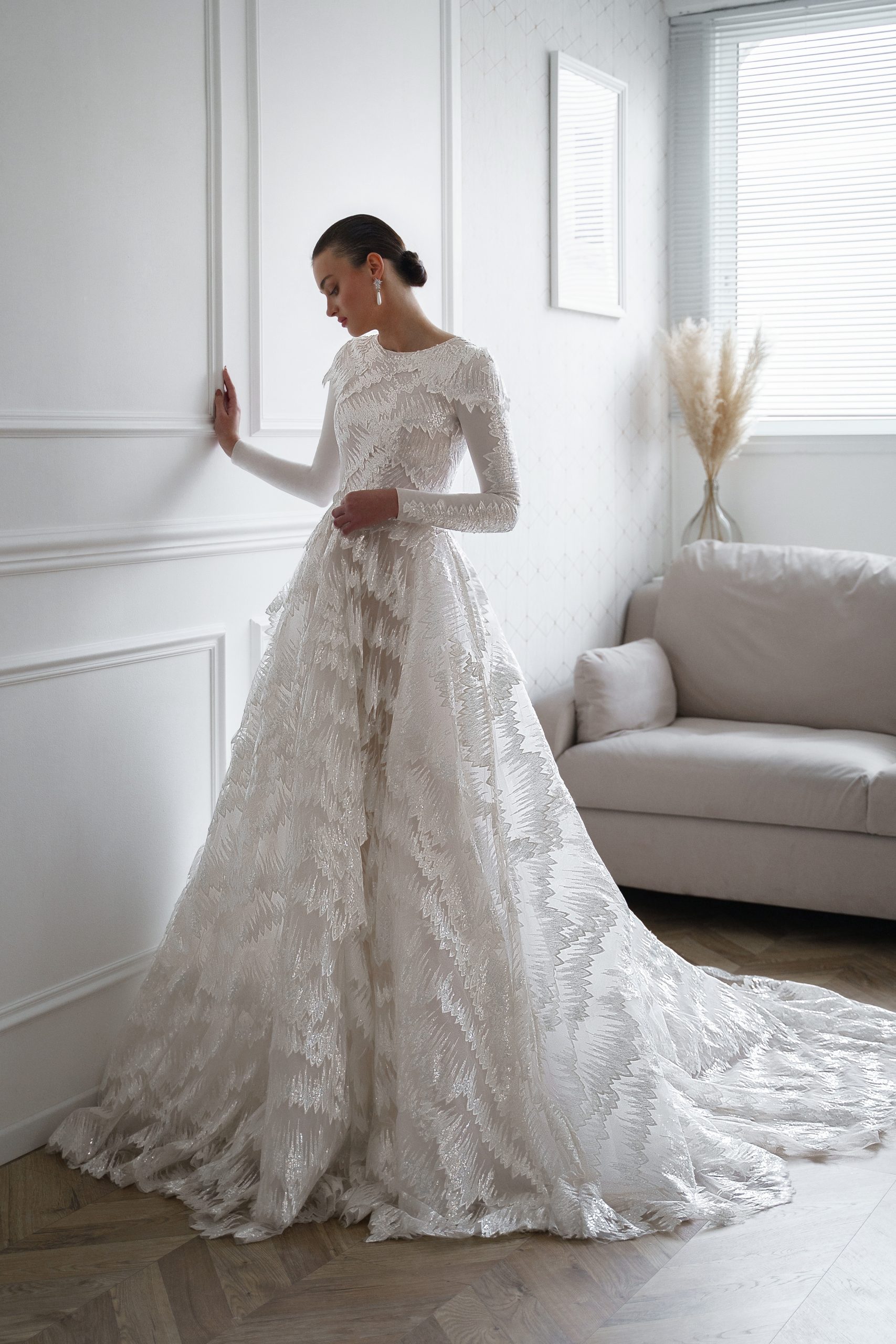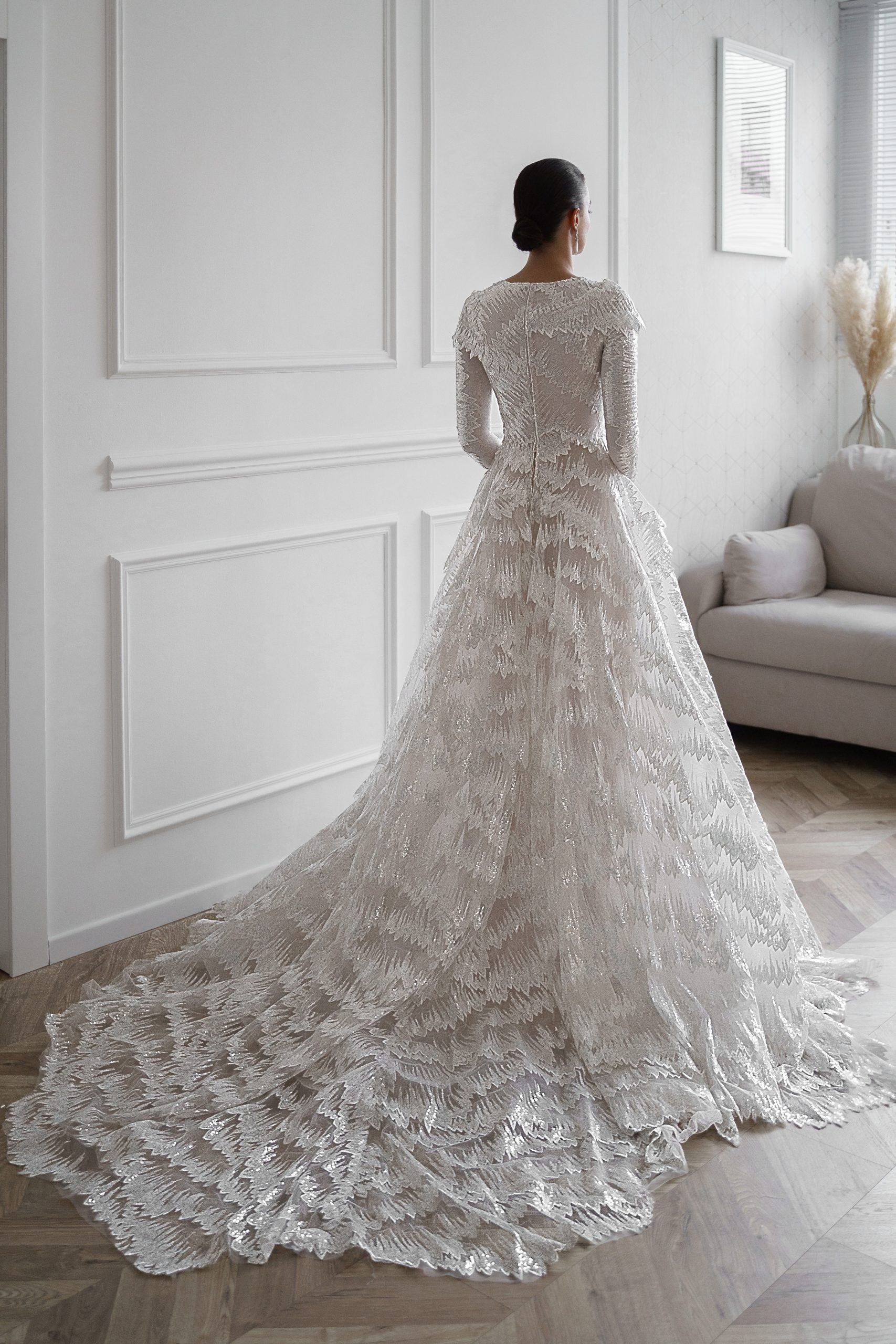 A dreamy dress featuring layers of fabric embroidered with sequins, unique and finished off with anextended, rich trail.