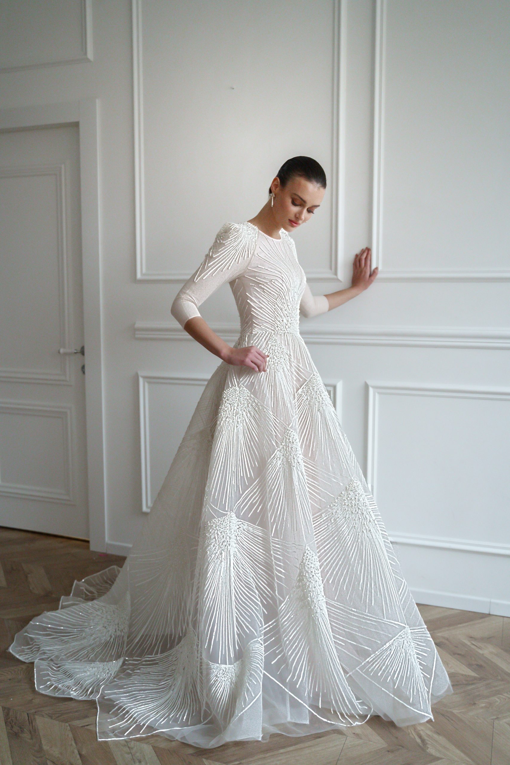 Delicately puffy sleeves and a spectacular trail dress up this intricately handmade beaded dress.